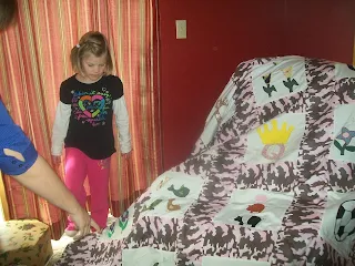 Today we had a visit from my friend Grace and her family. I love to see Grace, and wish she lived closer. An afternoon with her and her boys never lasts long enough. Grace is Madison and Quincy's Godmother. Several years ago, she made a quilt for Madison which Madison has cherished and slept with (because it is the softest, warmest quilt ever). This year, she made a quilt for Quincy. The quilt is really neat, Grace took all the things that Quincy loves and made blocks. There are pigs, cows, fish, a soccer ball, and even a ring neck snake block included in the quilt, and it is all bound together with pink cammo! Quincy is so, so excited about it. She even asked to go to bed early! I may have to try to get some better photos, as these don't show the entire quilt, but you can get the idea.