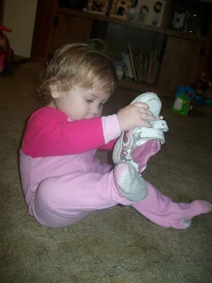 Harper was not too thrilled to see Saige trying on her shoes. I made her allow it however, because it kept Saige busy for a good half hour! :)