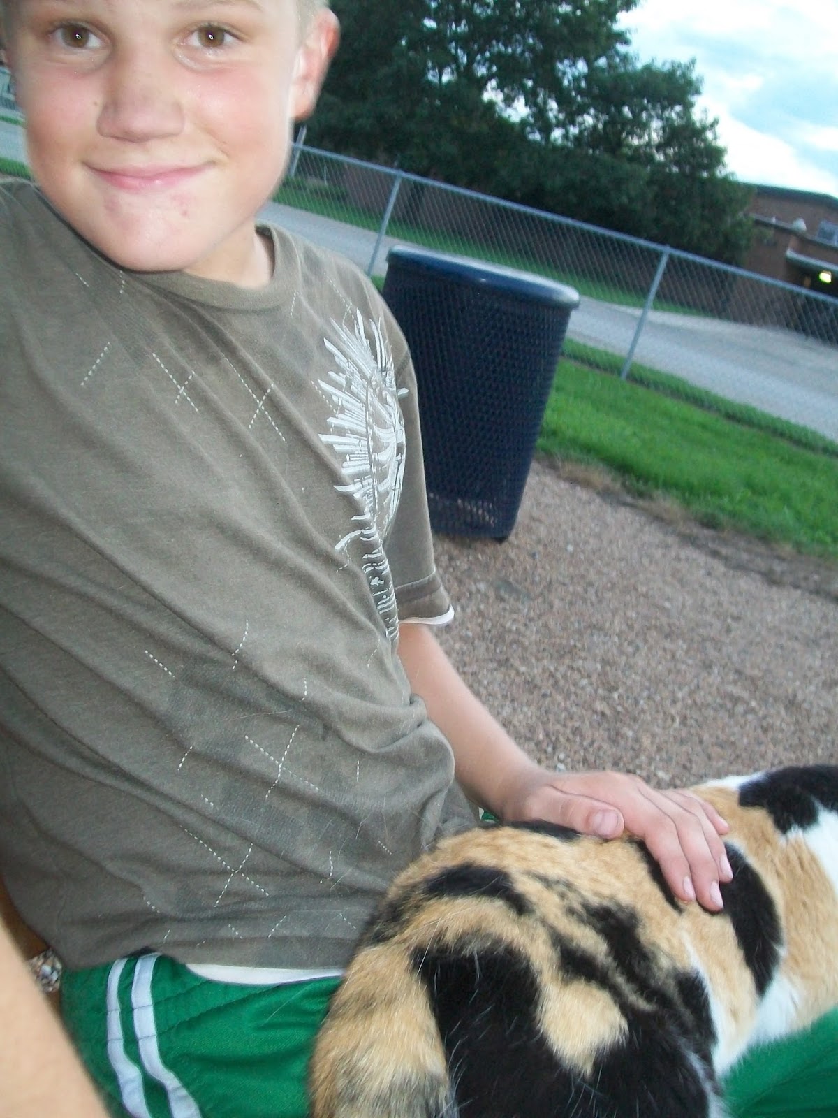 When we walk, the cat likes to tag along. I hope she won't do this when the kids start school! She does seem to enjoy hanging out with us at the park though!
