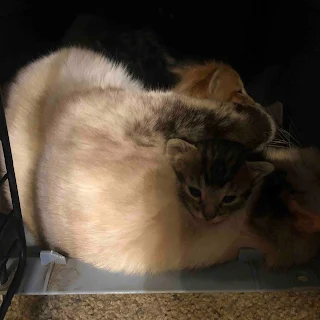 The strangest thing happened after we brought them home. Our indoor cat, Boomer has decided they are her babies. Of course, she’s been fixed and has no milk, but she has been laying with them, cleaning them and basically does all the care except feedings. I’m so thankful! She is a good momma cat!